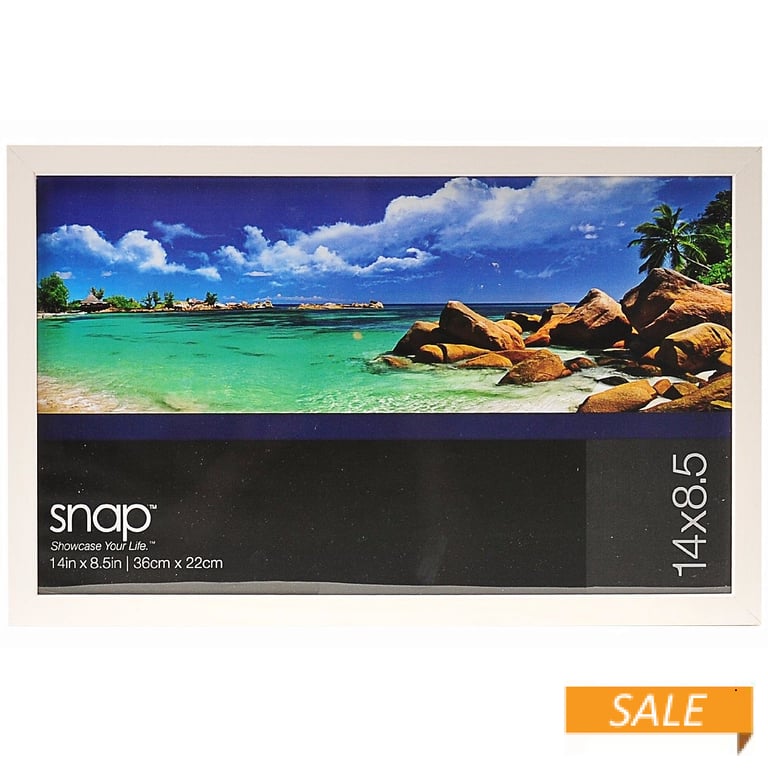Main view Angled Product Details SNAP White Wood Frame 14x8½ by SNAP™ — Show-off your print with this white furniture-finished solid wood frame. Displays a 14"x8½" print.Wall mounts are permanently attached to the backing, out of sight. Crafted by SNAP™. White Wood Frame 14x8½ by SNAP™ Model #038555429540 List $16.95 You pay $8.19 In stock Ships next business day [?] Your Price Match is Active Your request for a price of $0.00 for a minimum quantity of has been accepted. You have [time] left to purchase this item for $0.00 instead of $8.19 each. Find a Lower Price? We BEAT All Authorized Retailers [?] FEATURESDisplays:8.50"x14"Material:Wood (mdf/engineered)Finish:WhiteOccasion:Business & office, Friendship, Grandparent`s Day, Home decorating, Housewarming, Teacher gifts, Team & coach gifts, Thank-Motivate-Reward, Celebrating TravelsStyle:Architectural, ContemporaryOrientation:BothBrand:SNAPDisplay Type:Wall Only Approx. Overall Dimensions:15"x9 3/8"x5/8" This item ships in its own box SHARE THIS ITEM Share on Facebook