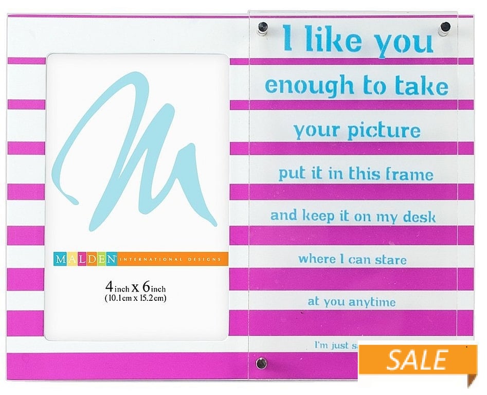 Product Details Malden Designs® I LIKE YOU ... keepsake frame by Malden® — I LIKE YOU is a special celebration keepsake frame to share and cherish. I LIKE YOU enough to take your picture put it in this frame and keep it on my desk where I can start at you nytime I'm just saying. Bold colors and fun graphics adorn this adorable frame. Glare resistant glass lens. Attractive hardboard backing for desktop display.Crafted by Malden®. I LIKE YOU ... keepsake frame by Malden® Malden Designs® FALL CELEBRATION Savings - ends SundayBuy More / Save More * Add this item to your cart for the full details of this promotion. Conditions may apply. Model #87131674 List $10.00 You pay $4.90 In stock Ships next business day [?] Your Price Match is Active Your request for a price of $0.00 for a minimum quantity of has been accepted. You have [time] left to purchase this item for $0.00 instead of $4.90 each. Find a Lower Price? We BEAT All Authorized Retailers [?] FEATURESDisplays:4"x6"Material:Wood (mdf/engineered)Finish:Pink, WhiteOccasion:Christmas, Friendship, Inspirational, Sweet 16Style:Bold Colors, Contemporary, Sports & leisure, Teens & tweens, Words & whimsy, Expressions > ready madeOrientation:Vertical OnlyBrand:Malden Designs® Approx. Overall Dimensions:9 5/8"x7 1/2"x3/4" This item ships in its own box SHARE THIS ITEM Share on Facebook