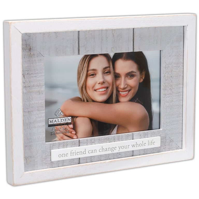Main view Product Details Malden Designs® ONE FRIEND CAN CHANGE YOUR WHOLE LIFE 6x4 frame — Celebrate good times with the special ONE FRIEND CAN CHANGE YOUR WHOLE LIFE 6x4 frame.Weathered white mdf wood with grey plank type mat.Glare resistant glass lens. Hardboard easel back for tabletop display. Wall hooks included for easy hanging.This novelty frame is produced by Malden USA®. ONE FRIEND CAN CHANGE YOUR WHOLE LIFE 6x4 frame Model #096287185233 List $17.00 You pay $12.95 In stock Ships next business day [?] Your Price Match is Active Your request for a price of $0.00 for a minimum quantity of has been accepted. You have [time] left to purchase this item for $0.00 instead of $12.95 each. Find a Lower Price? We BEAT All Authorized Retailers [?] FEATURESDisplays:4"x6"Material:Wood (mdf/engineered)Finish:Gray/Charcoal, WhiteOccasion:Birthday, Friendship, Housewarming, Weekend Host GiftsStyle:Contemporary, Distressed - Weathered, Sentiments | ready made, Words & whimsyOrientation:Horizontal OnlyBrand:Malden Designs®Display Type:Desktop or Wall Approx. Overall Dimensions:7"x6 1/4"x3/4" This item ships in its own box SHARE THIS ITEM Share on Facebook