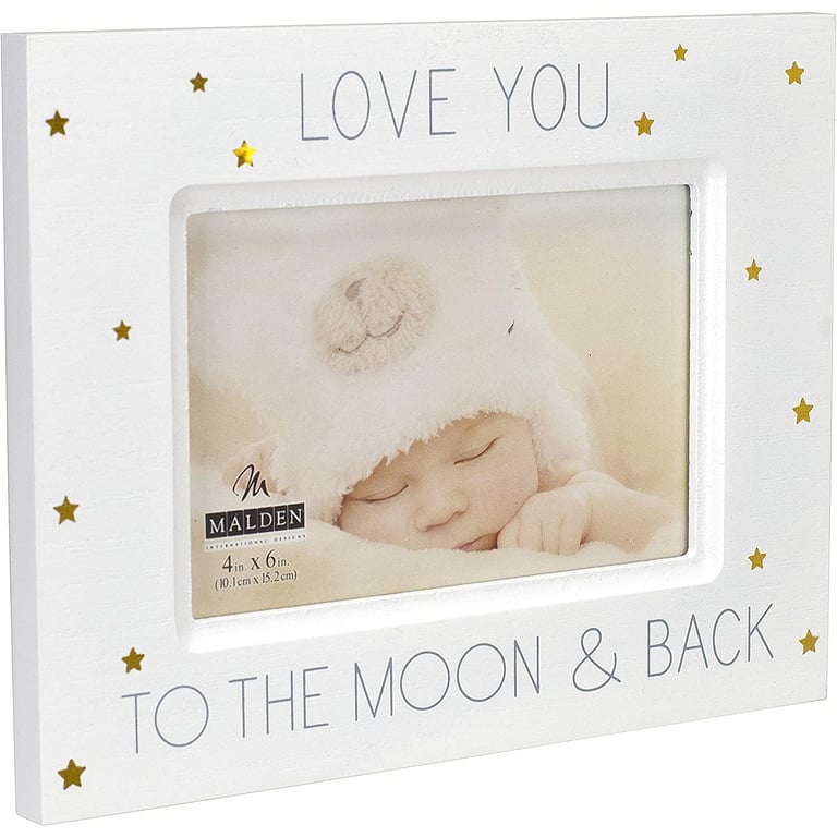 Main view Product Details Malden Designs® LOVE YOU TO THE MOON AND BACK Baby 6x4 frame — LOVE YOU TO THE MOON & BACK For everyone on your LOVE LIST - an adorable frame to hold a 6"x4" favorite photo. Glare resistant glass lens.Crafted by Malden Designs®, New England. LOVE YOU TO THE MOON AND BACK Baby 6x4 frame Model #096287147330 List $19.00 You pay $13.95 In stock Can be shipped today [?] Your Price Match is Active Your request for a price of $0.00 for a minimum quantity of has been accepted. You have [time] left to purchase this item for $0.00 instead of $13.95 each. Find a Lower Price? We BEAT All Authorized Retailers [?] FEATURESDisplays:4"x6"Material:Wood (mdf/engineered)Finish:Gold, WhiteOccasion:Baby shower, Birthday (child), Baptism + Christening, Grandparent`s Day, Mother`s Day, New baby, Romantic, Sweet 16, Valentine`s DayStyle:Coastal, Contemporary, Romantic, Words & whimsy, Sentiments | ready madeOrientation:Horizontal OnlyBrand:Malden Designs®Display Type:Desktop or Wall Approx. Overall Dimensions:9 1/4"x7 1/4"x1" This item ships in its own box SHARE THIS ITEM Share on Facebook