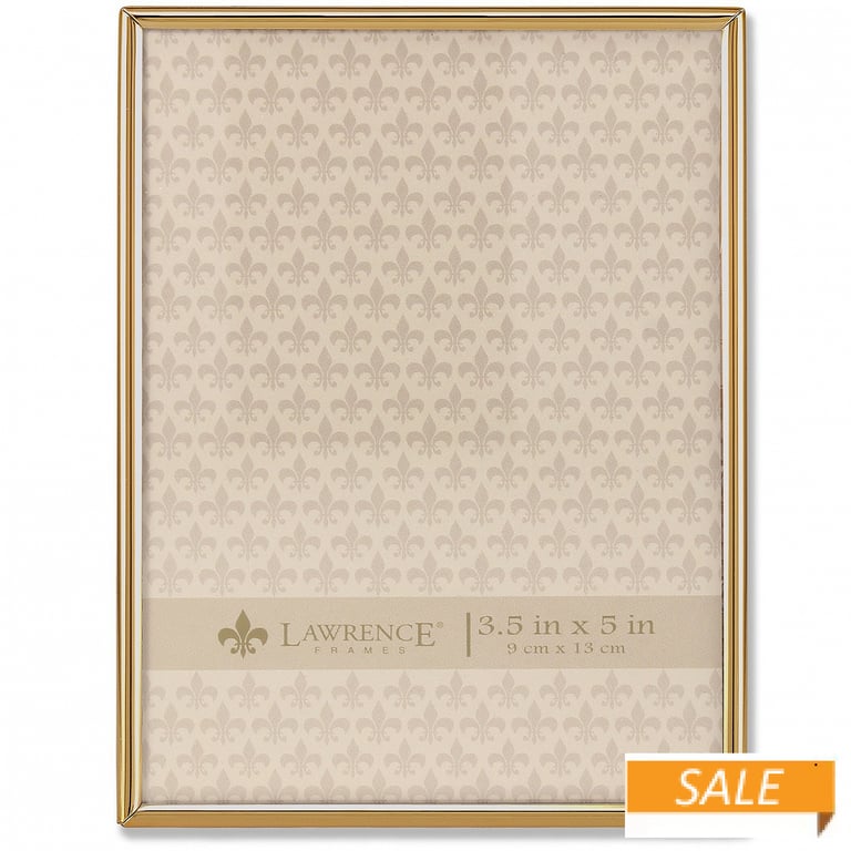 Main view Angled Reverse Product Details Lawrence Frames® Polished SIMPLY GOLD 3½x5 frame by Lawrence® — Lawrence's polished goldplated frame is a nicely crafted frame with a "simple", minimal profile.Glare resistant glass lens. Quality fitted back with easel for tabletop easel display or wall mounts for easy hanging.By Lawrence®. Polished SIMPLY GOLD 3½x5 frame by Lawrence® Model #751148072236 List $17.00 You pay $9.90 In stock Ships next business day [?] Your Price Match is Active Your request for a price of $0.00 for a minimum quantity of has been accepted. You have [time] left to purchase this item for $0.00 instead of $9.90 each. Find a Lower Price? We BEAT All Authorized Retailers [?] FEATURESDisplays:3.50"x5"Material:Gold plateFinish:GoldOccasion:Anniversary, Birthday, Good luck, Mother`s Day, Retirement, Romantic, Teacher gifts, Thank-Motivate-Reward, Celebrating Travels, Valentine`s Day, Wedding, Business & office, Corporate gifts, Home decorating, Team & coach giftsStyle:Classic, Minimal, Traditional, Contemporary, Sophisticated, RomanticOrientation:BothBrand:Lawrence Frames®Display Type:Desktop or Wall This item ships in its own box SHARE THIS ITEM Share on Facebook