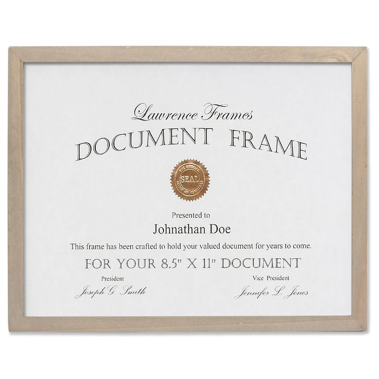 Main view Product Details Lawrence Frames® SQUARE CORNER Gray Stain 8½x11 frame by Lawrence Frames® — From Lawrence®, a square corner "flat-top".Frame edge is a very contemporary ½" all-around.Beautifully finished hardwood moulding with tapered seams. Glare resistant glass lens. Attractive black hardboard back. SQUARE CORNER Gray Stain 8½x11 frame by Lawrence Frames® Model #751148076692 List $25.00 You pay $22.95 In stock Ships next business day [?] Your Price Match is Active Your request for a price of $0.00 for a minimum quantity of has been accepted. You have [time] left to purchase this item for $0.00 instead of $22.95 each. Find a Lower Price? We BEAT All Authorized Retailers [?] FEATURESDisplays:8.50"x11"Material:Wood (full grain)Finish:Gray/CharcoalOccasion:Business & office, Corporate gifts, Home decoratingStyle:Classic, Architectural, Minimal, ContemporaryOrientation:BothBrand:Lawrence Frames®Display Type:Desktop or Wall Approx. Overall Dimensions:9 3/8"x11 7/8"x3/4" This item ships in its own box SHARE THIS ITEM Share on Facebook