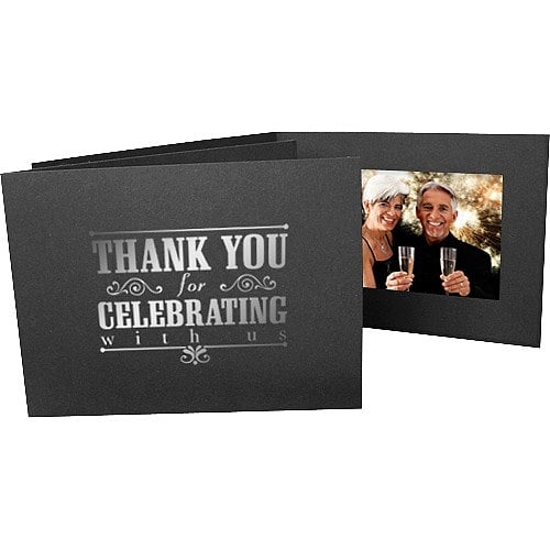 Main view Sizing Unfilled Product Details Collectors Gallery THANK YOU FOR CELEBRATING WITH US foil on Black Cardstock Photomount 6x4 Folder — Our photo folder in black, accent with foil THANK YOU FOR CELBRATING message. The design is hot stamped (imprinted) onto the front of the folder as shown.Use as is, or personalize by adding your company name, event, organization and/or logo. Overall size measures 6" x 8 1/8" (when closed) Picture opening measures 3 5/8" x 5 5/8" (for 4" x 6" photos) Lightweight smooth finish paper Foil hot-stamped design on front cover Holds one photo on the inside Side-load construction Available for vertical (see below) or horizontal (here) prints Shipped flat, not folded Envelopes available separately - See Suggested Accessories below (not required). Optional foil imprinting available Made in the U.S.A. THANK YOU FOR CELEBRATING WITH US foil on Black Cardstock Photomount 6x4 Folder Model #021352153992 List $25.00 You pay $19.50 ( set of 25 / $0.78 ea ) This item IS in stock and can be expected to ship 01/30/2026 In stock Your Price Match is Active Your request for a price of $0.00 for a minimum quantity of has been accepted. You have [time] left to purchase this item for $0.00 instead of $0.78 each. Find a Lower Price? We BEAT All Authorized Retailers [?] FEATURESDisplays:4"x6"Material:Card-stockFinish:BlackOccasion:Group Events + PartiesStyle:Traditional, Eco-Friendly-RecycledOrientation:Horizontal OnlyDisplay Type:not applicable n/a Approx. Overall Dimensions:8 1/8"x6" SHARE THIS ITEM Share on Facebook