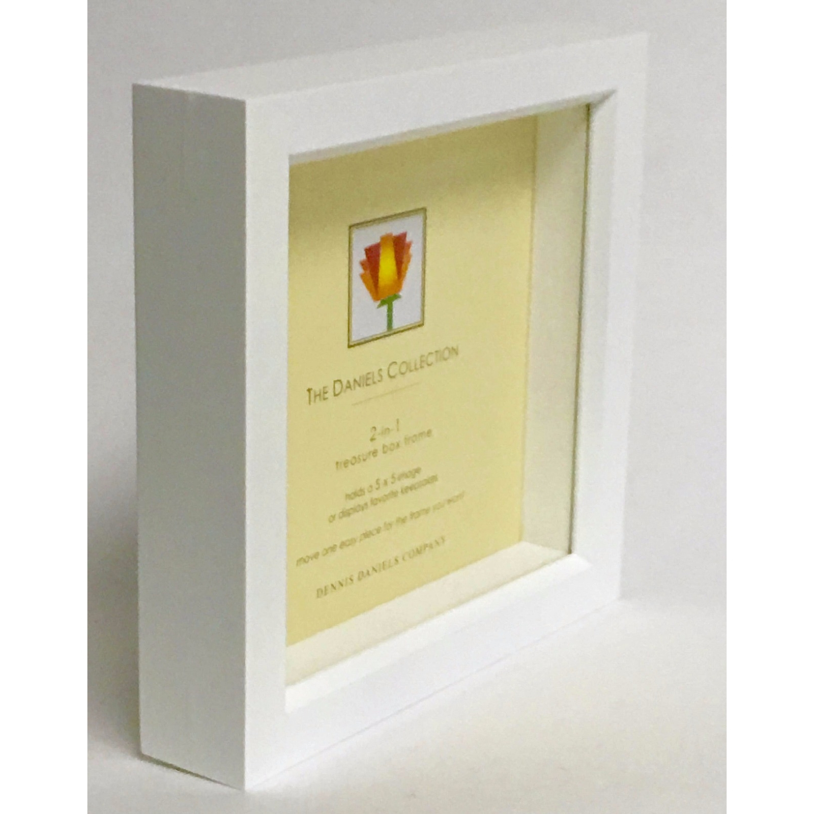 Main view Product Details Dennis Daniels® 2-in-1 Bright-White stain 5x5 shadow box ½in deep for your print or collectibles by Dennis Daniels® — This is a beautiful shadowbox picture frame to hold a 5" x 5" print or display your print - or keepsake with its 1¼" depth (½" from glass to print). Border width measures approximately ¾".Perfect for memorabilia, shells, sand designs, miniature crafts, dried flowers - and your fine photo in a dramatic display. Great for displaying children's 'Objets d'Art'.Crafted of very nice solid woods; staining process allows the wood grain to show through. Glare resistant glass lens is removable. Recessed wall mounts included for easy hanging. Or stand on its side for tabletop display.Hand-made by Dennis Daniels® of California. 2-in-1 Bright-White stain 5x5 shadow box ½in deep for your print or collectibles by Dennis Daniels® Model #80021536 List $22.50 You pay $18.95 This item is currently out of stock and we do not have an expected date at the present time. click here to be automatically notified when it comes back in stock or email merchandising@sendaframe.com for availability information. You can place this item in your shopping cart. It will be added to the 'saved for later' section. Your Price Match is Active Your request for a price of $0.00 for a minimum quantity of has been accepted. You have [time] left to purchase this item for $0.00 instead of $18.95 each. Find a Lower Price? We BEAT All Authorized Retailers [?] FEATURESDisplays:5"x5"Material:Wood (full grain)Finish:WhiteOccasion:Birthday, Craft Projects, Get well, Good luck, Home decorating, Housewarming, Corporate giftsStyle:Contemporary, MinimalOrientation:BothBrand:Dennis Daniels®Display Type:Desktop or Wall Approx. Overall Dimensions:6"x6"x1 1/4" This item ships in its own box SHARE THIS ITEM Share on Facebook