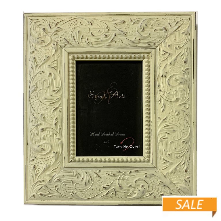 Main view Back (sample) Product Details Epoch Art™ Retro PASTORAL style in antiqued-white tones by Epoch Arts® — This is a lovely picture frame, white-washed antiqued for sophisticated tastes.Hand tooled, hand crafted hardwood.Features a fully finished wood back and very nice dual easel back for portrait or landscape use.Crafted by Epoch Arts®, this is a lovely center-picture frame type addition to your room decor. To view the complete collection, click: Epoch Arts® Classic Reproductions PASTORAL style in antiqued-white tones by Epoch Arts® Model #816558007190 List $32.50 You pay $15.90 In stock Ships next business day [?] Your Price Match is Active Your request for a price of $0.00 for a minimum quantity of has been accepted. You have [time] left to purchase this item for $0.00 instead of $15.90 each. Find a Lower Price? We BEAT All Authorized Retailers [?] FEATURESDisplays:4"x5"Material:Wood (full grain)Finish:Ivory/Cream, WhiteOccasion:Anniversary, Thank-Motivate-Reward, Wedding, Home decoratingStyle:Antique, Distressed - Weathered, Ornate, Rustic/Lodge, Shabby Chic, Vintage VictorianOrientation:BothBrand:Epoch Art™ RetroDisplay Type:Desktop or Wall This item ships in its own box SHARE THIS ITEM Share on Facebook