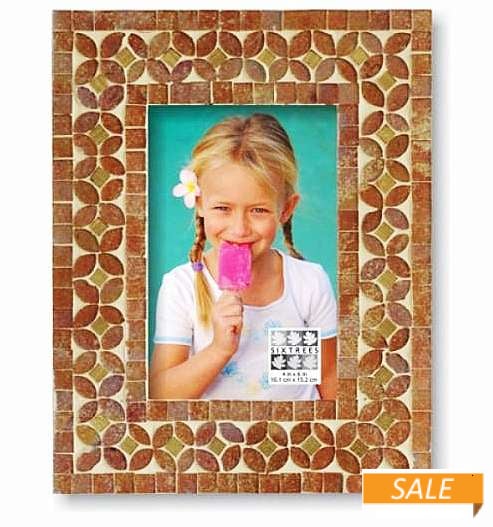 Product Details SIXTREES® GOLDEN MOSAIC frame by Sixtrees® — Beautifully decorate your 4"x6" print or photo with this new mosaic inlay frame. Glare resistant glass lens,Dual easel permits both portrait or landscape tabletop display.Produced by Sixtrees®. GOLDEN MOSAIC frame by Sixtrees® Model #29184830 List $16.95 You pay $8.19 In stock Can be shipped today [?] Your Price Match is Active Your request for a price of $0.00 for a minimum quantity of has been accepted. You have [time] left to purchase this item for $0.00 instead of $8.19 each. Find a Lower Price? We BEAT All Authorized Retailers [?] FEATURESDisplays:4"x6"Material:Natural StoneFinish:BrownOccasion:Birthday, Friendship, Get well, Good luck, Home decorating, Housewarming, Teacher gifts, Celebrating TravelsStyle:Arabesque, OrnateOrientation:BothBrand:SIXTREES® This item ships in its own box SHARE THIS ITEM Share on Facebook