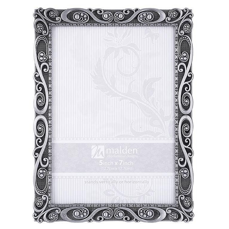 Back to results Scroll Items 6317 of 11390 Main view Product Details Malden Designs® MORGAN Pewter SWIRL 5x7 frame by Malden® — The beautiful MORGAN PEWTER SWIRL frame is fully articulated and a joy to enhance a lovely print.Seamless moulding and ornate floral border surrounds your print.Elegant back has a dual easel for portrait or landscape use. Wall mounts included for easy hanging.Crafted by Malden®. MORGAN Pewter SWIRL 5x7 frame by Malden® Malden Designs® FALL CELEBRATION Savings - ends SundayBuy More / Save More * Add this item to your cart for the full details of this promotion. Conditions may apply. Model #87134057 List $24.00 You pay $17.95 In stock Ships next business day [?] Your Price Match is Active Your request for a price of $0.00 for a minimum quantity of has been accepted. You have [time] left to purchase this item for $0.00 instead of $17.95 each. Find a Lower Price? We BEAT All Authorized Retailers [?] FEATURESDisplays:5"x7"Material:Pewter (plate)Finish:SilverOccasion:Anniversary, Birthday, Congratulations, Engagement, Good luck, Mother`s Day, Housewarming, Retirement, Romantic, Thank-Motivate-RewardStyle:Antique, Asian Zen, Classic, Romantic, OrnateOrientation:BothBrand:Malden Designs®Display Type:Desktop or Wall Approx. Overall Dimensions:6 1/2"x8 1/2"x1" This item ships in its own box SHARE THIS ITEM Share on Facebook