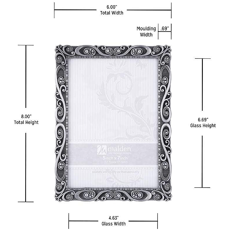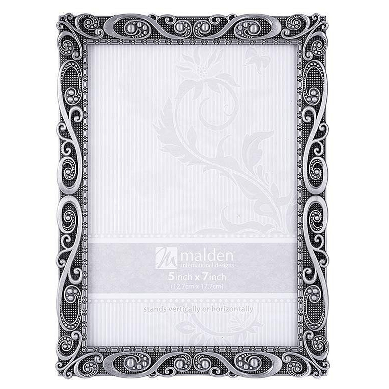 Main view Product Details Malden Designs® MORGAN Pewter SWIRL 5x7 frame by Malden® — The beautiful MORGAN PEWTER SWIRL frame is fully articulated and a joy to enhance a lovely print.Seamless moulding and ornate floral border surrounds your print.Elegant back has a dual easel for portrait or landscape use. Wall mounts included for easy hanging.Crafted by Malden®. MORGAN Pewter SWIRL 5x7 frame by Malden® Malden Designs® FALL CELEBRATION Savings - ends SundayBuy More / Save More * Add this item to your cart for the full details of this promotion. Conditions may apply. Model #87134057 List $24.00 You pay $17.95 In stock Ships next business day [?] Your Price Match is Active Your request for a price of $0.00 for a minimum quantity of has been accepted. You have [time] left to purchase this item for $0.00 instead of $17.95 each. Find a Lower Price? We BEAT All Authorized Retailers [?] FEATURESDisplays:5"x7"Material:Pewter (plate)Finish:SilverOccasion:Anniversary, Birthday, Congratulations, Engagement, Good luck, Mother`s Day, Housewarming, Retirement, Romantic, Thank-Motivate-RewardStyle:Antique, Asian Zen, Classic, Romantic, OrnateOrientation:BothBrand:Malden Designs®Display Type:Desktop or Wall Approx. Overall Dimensions:6 1/2"x8 1/2"x1" This item ships in its own box SHARE THIS ITEM Share on Facebook